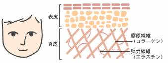 張りと弾力のある健康でみずみずしい肌は、膠原(こうげん)線維(コラーゲン)が綱目状に規則正しく並び、弾力線維(エラスチン)がからみつくようにして、弾力を保っています。